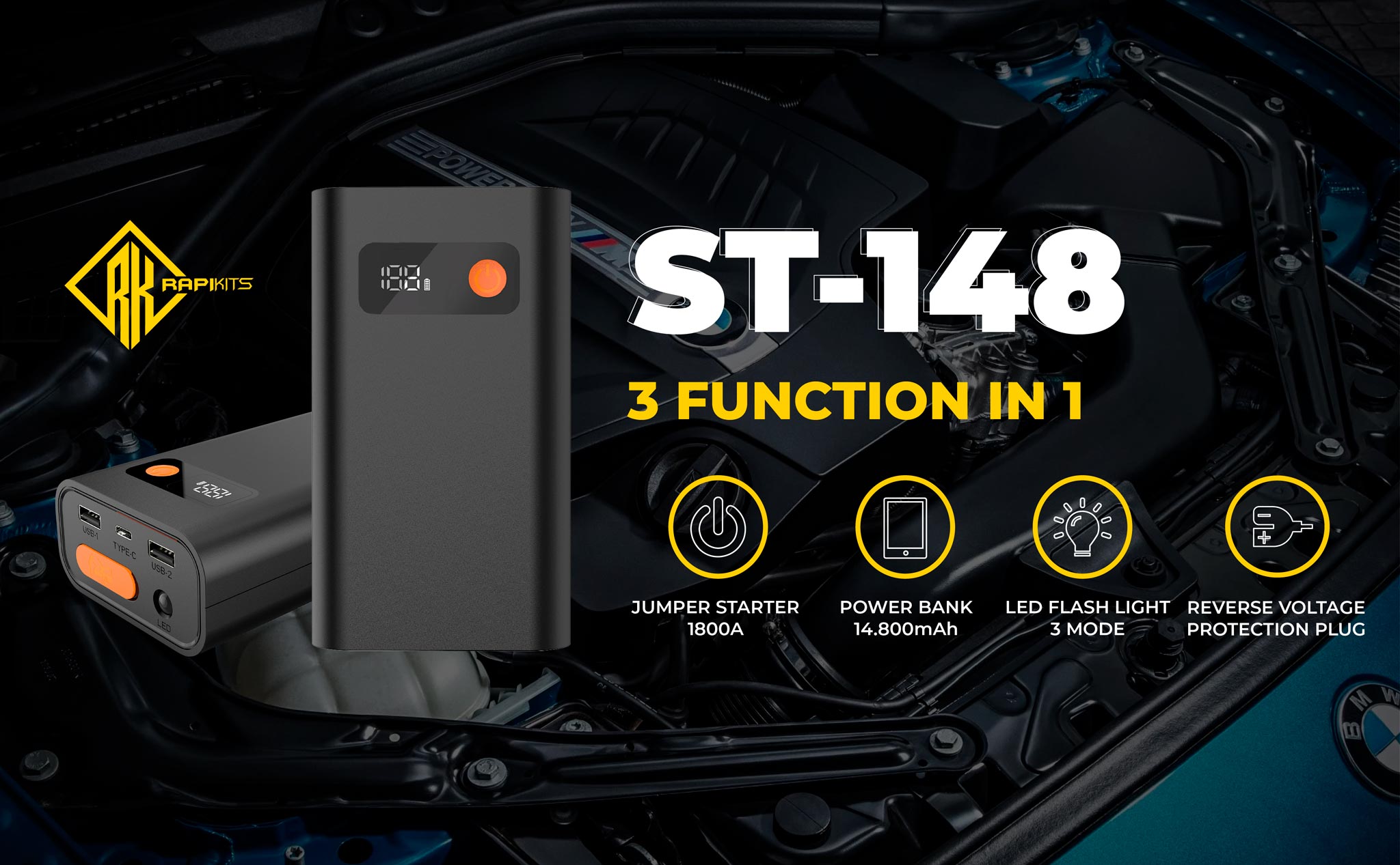 5-IN-1 MULTIFUNCTION: This device functions as a jump starter, portable power bank, and an LED flashlight with 3 modes (flashlight, strobe, SOS). The RAPIKITS ST-148 Battery Jump Starter is your reliable, all-around trip companion here to gear you up for every adventure.